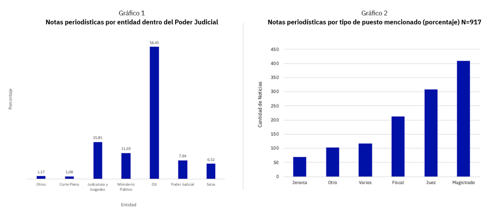 El 83% de las notas periodísticas se concentran en tres entidades: el Organismo de Investigación Judicial (OIJ), la Judicatura y el Ministerio Público. Las notas individualizadas hacia actores concretos son pocas (9%) y las figuras con mayor exposición son los magistrados, particularmente a partir de 2017, los jueces y juezas, y los y las fiscales (gráficos 1 y 2).