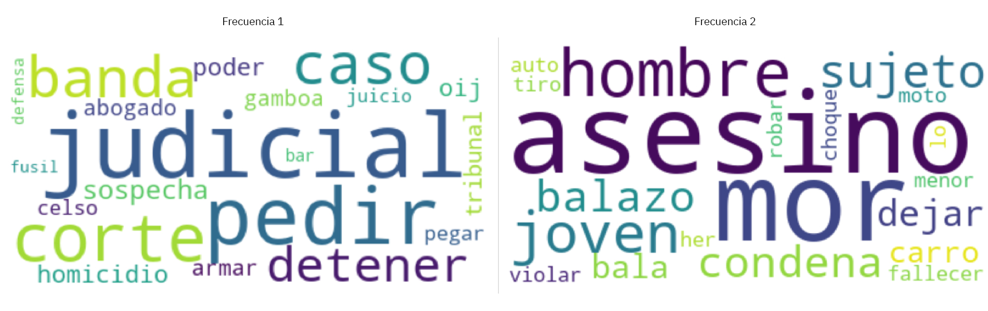 Los temas que más concentran la atención mediática son, sin duda, los sucesos. El análisis de las expresiones más utilizadas en las notas periodísticas permiten determinar la existencia de “nubes” de palabras, o clasificación de frecuencias, estudio realizado mediante análisis de texto de los titulares de estas noticias con herramientas de “machine learning”. Las dos nubes de palabras (frecuencias 1 y 2) corresponden a las relaciones más fuertes entre palabras más empleadas en los titulares.